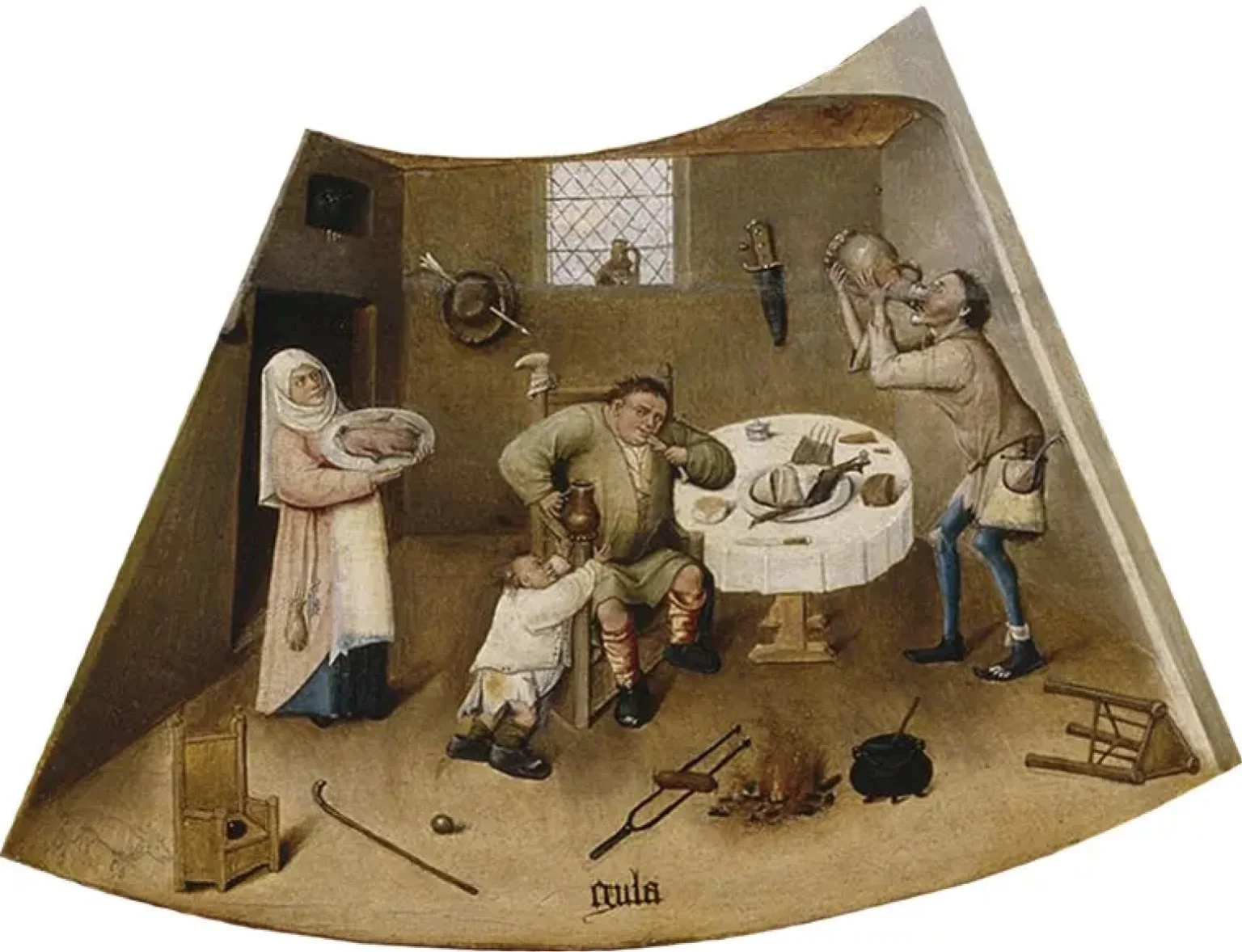 “La gula, amigo mío, es la gula del Bosco lo que andas viendo”, le escuché decir a Julio, esta vez desde su cocina. Después me enteraría de que es una serie completa representando los siete pecados capitales. Me pareció grotesco. En especial, el desorden que gobernaba la escena: juguetes, trinchos, sillas, todos sueltos, tal como las casas después de una fiesta. “Pobres, ¿no?, me soltó Julio, con un vaso de agua en la mano. La gula hace que uno descuide lo suyo…. Más que me mata que nadie mire a nadie, y peor estando en una mesa. ¿Qué otro lugar tienen las familias para mirarse en esta vida? Bueno, el niño es el único que mira a alguien, pero en realidad está buscando que el papá le suelte un pedazo de algo. ¿Y el don? Pues con cara solemne de ocupado, como si no hubiese nada más allá que el hueso chupado que tiene en la mano y la jarra llena. La gula es, pues, hermano mío, la mente atravesada para siempre por una flecha, como ese sombrero detrás del man”.