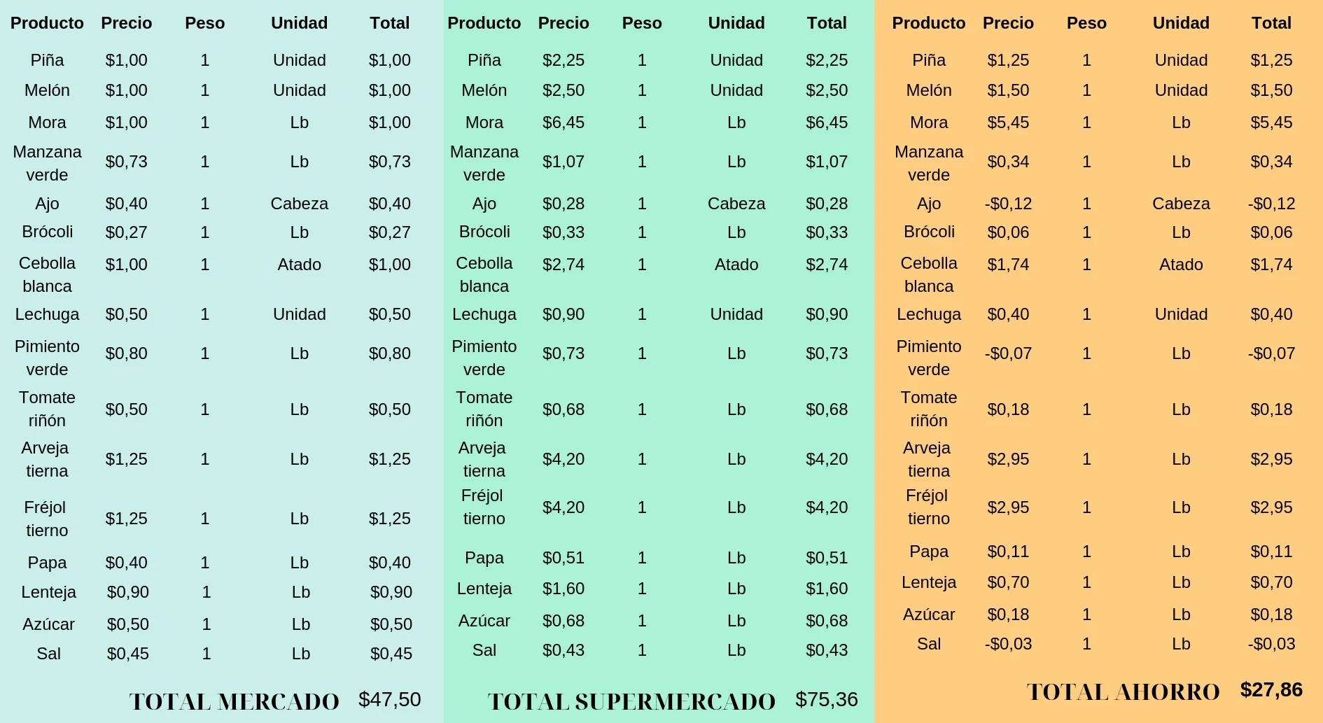Funciona de la siguiente manera, el precio total se construye en base al valor unitario y a la cantidad que se desea adquirir de cada producto; la mayoría de los mismos se encuentran en libras, aunque hay pocos que se encuentran en otras unidades. Lo único que se debe hacer para elegir sobre una alternativa, es cambiar el peso en el cuadro referente a MERCADO, automáticamente se realiza lo mismo en el segundo cuadro (SUPERMERCADO), mientras que el tercer y último recuadro indica cual es la diferencia y el posible ahorro generado a partir de las cantidades establecidas durante el primer paso. Puedes descargar el archivo en Excel y editarlo acorde a tu cantidad de compras haciendo click aquí.