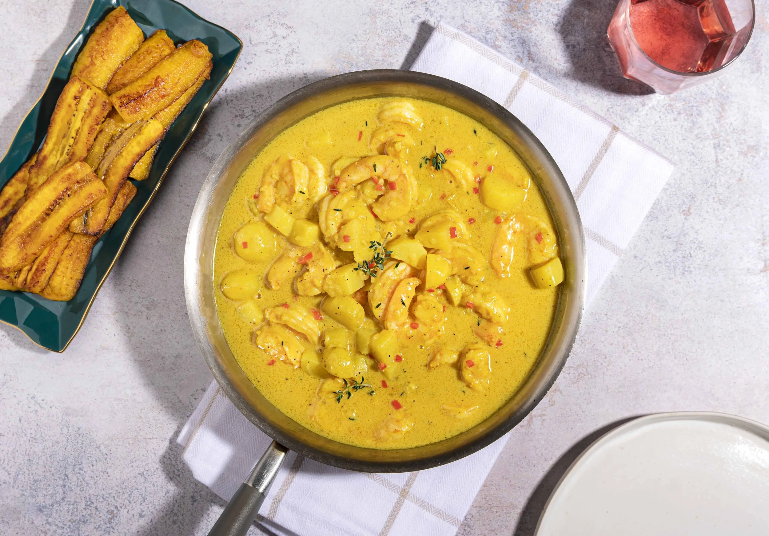 Prueba estos camarones encocados con curry acompañados de plátanos maduros fritos. Esta receta es una mezcla del tradicional encocao ecuatoriano con una salsa de curry. Todo va aromatizado con ají y cilantro o chillangua (el cilantro esmeraldeño).