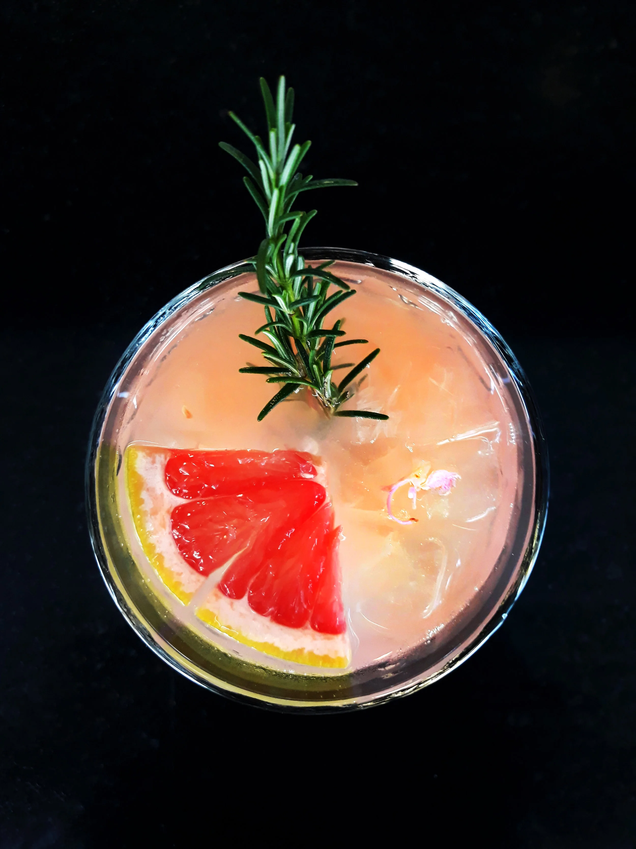 Colocar por dentro el slice de limón y encima el de pomelo. Introducir la rama de romero y finalizar con las flores de romero.