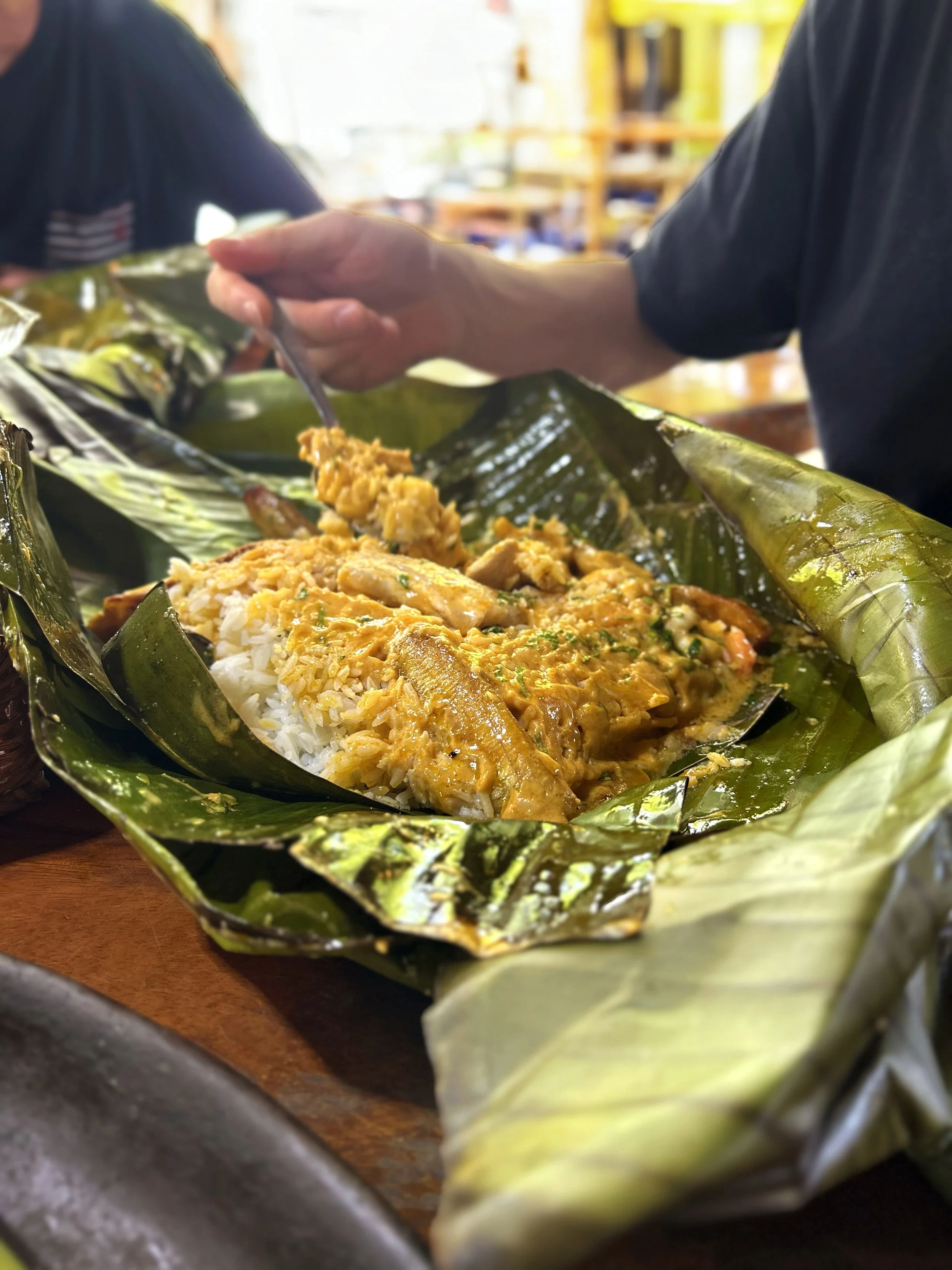 Una Pilsener fría o un jugo de maracuyá inician la comida, acompañados de unos verdes asados en el horno manaba con sal prieta. Luego llega este regalo bien envuelto en hoja de plátano, que lo protege y aromatiza simultáneamente. Solo queda abrirlo con la expectativa de la delicia que nos espera dentro: arroz, salsa de maní, mariscos cocinados en su jugo y unos maduros fritos que aportan el contraste perfecto con su dulzor.